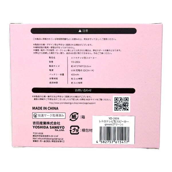 主な仕様:USB充電式(ケーブル付属)|技適マーク取得済み|充電時間:3~4時間|使用時間:3~4時間(満充電)|Bluetooth5.0|バッテリー容量:400mAh|簡単なボタン操作|SDカード使用可能(microSD)|コンパクトサイズで家でもアウトドアでも楽しめる|箱入り|中国製|重量:約200g
