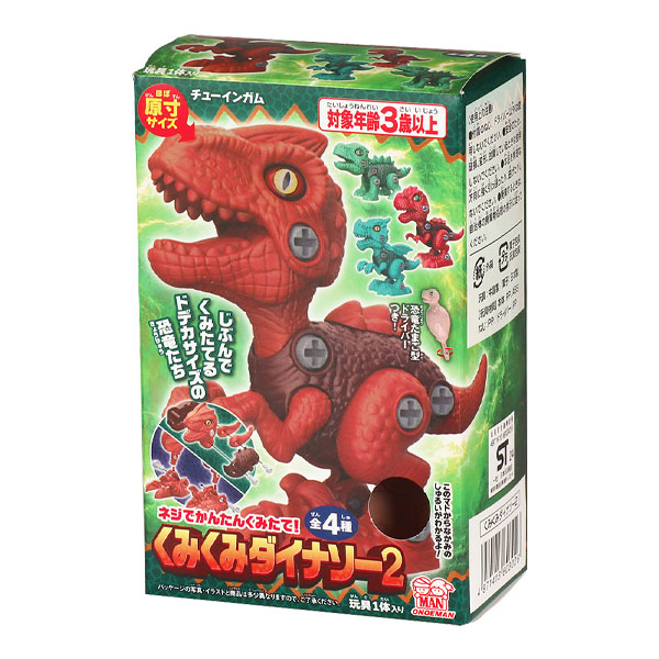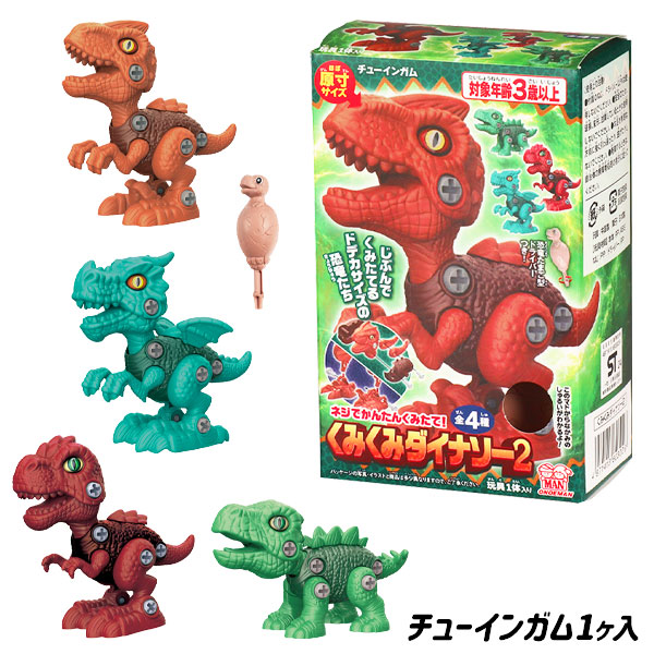 主な仕様:手・足・首・口・しっぽが動く|ネジで組み立てるタイプ|恐竜たまご型ドライバー付|チューイングガム1ヶ入|対象年齢3歳以上|重量:約87g