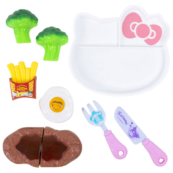 主な仕様:セット内容:ステーキ、ブロッコリー、ポテト、目玉焼き、ナイフ、フォーク、ミルクパック、キティ型プレート、紙ナプキン、三角POP、ポイントカード(各1ヶ)、クーポン2枚|ブリスターパック入|材質:ステーキ,ブロッコリー,ポテト:ABS/目玉焼き:PE/ナイフ,フォーク,キティ型プレート/PP|重量:約205g